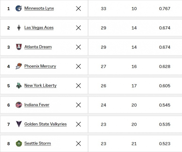 如此一来,本赛季WNBA季后赛8强全部出炉,分别是山猫、王牌、梦想、水星、自由人、狂热、女武神和风暴。